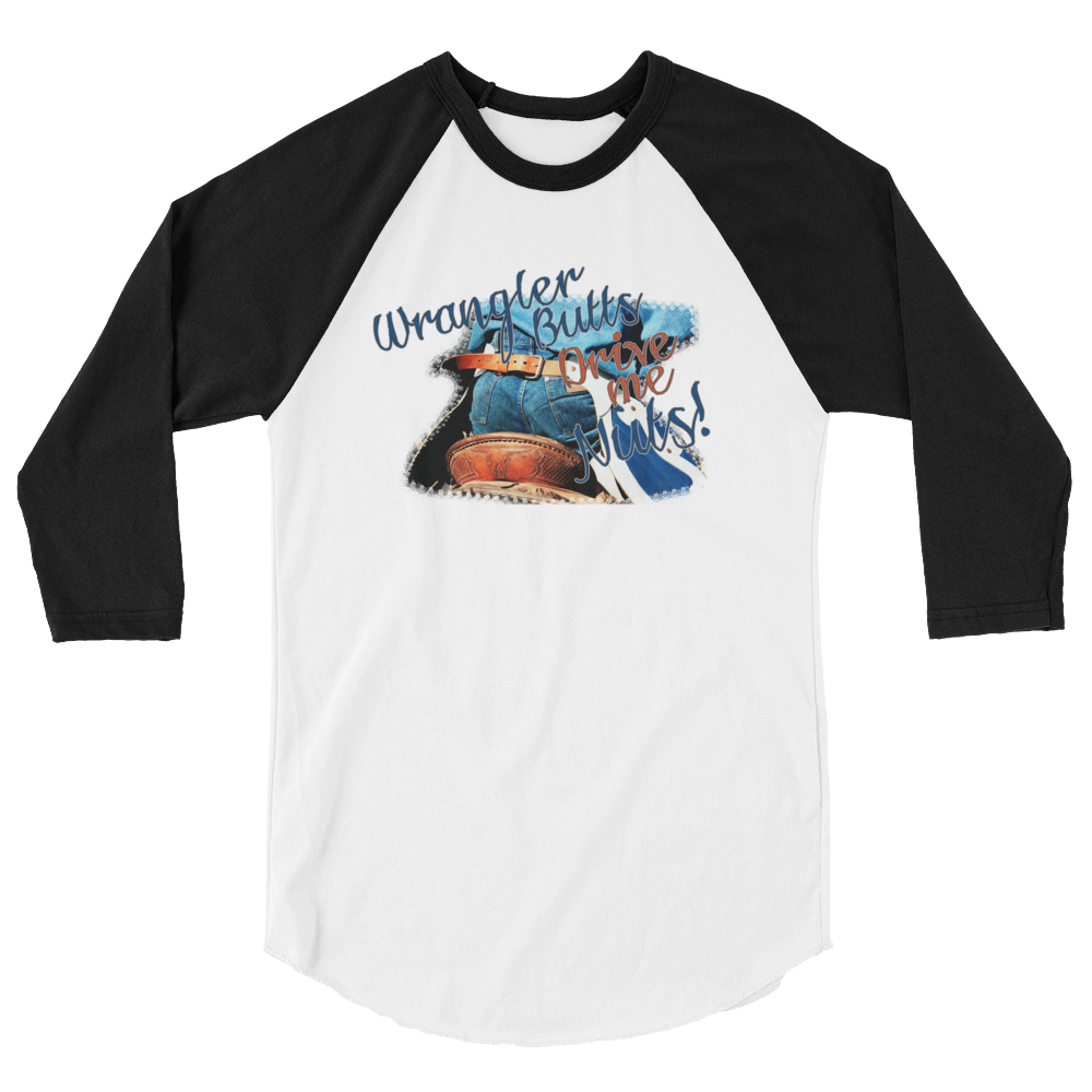 A stylish spin on the classic baseball raglan. The combed cotton blend makes it super soft, comfortable, and lightweight. Wrangler Butts Drive Me Nuts design by Amanda Smith Western Photographic Artist and Photographer at www.AmandaSmithWesternArt.com
